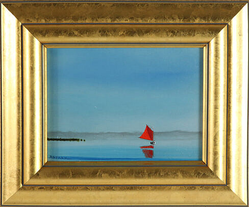 Robert Stark Jr. Miniature Oil on Canvas “Lone Red Sail Off Headland”