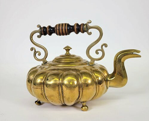 Antique Continental Brass Melon Form Tea Hot Water Kettle, 19th Century