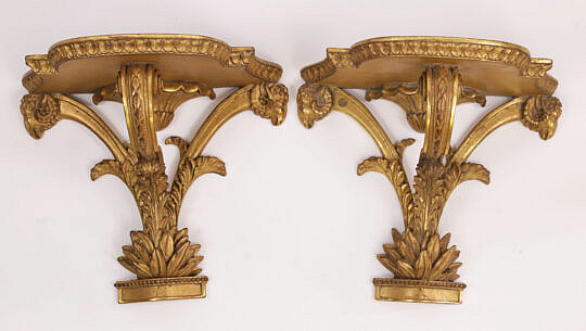 Pair of Mid-Century Italian Gilt Composition Ram’s Head Bracket Shelves, circa 1960