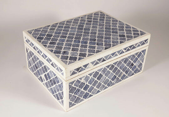 Contemporary Dyed Blue and White Bone Geometric Inlaid Wooden Box