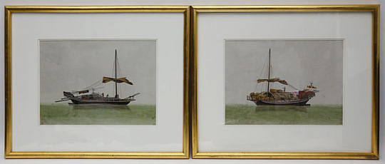 Pair of Chinese Export Watercolors “Commercial River Boats”, circa 1870