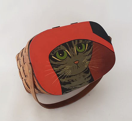 Vintage Maggie Meredith Nantucket Hand Painted Cat in a Hat Woven Picnic Basket