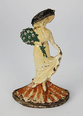Vintage Painted Cast Iron Doorstop of Lady Holding a Bouquet