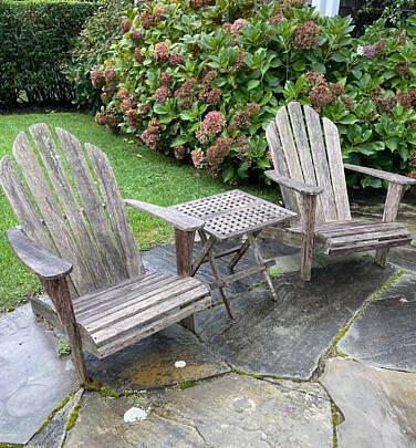 Pair of Outdoor Classics Teak Adirondack Style Chairs and Hatch Top Side Table