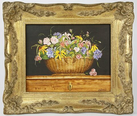 Kathryn White Cerasulo Oil “Nantucket Basket Floral Bouquet Still Life”