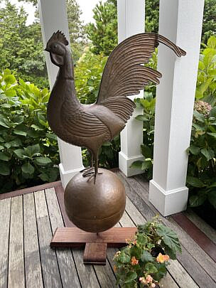Folk Art Hammered Copper Rooster Weathervane on Cherry Base