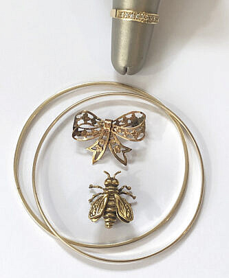 Two Gold Bangles, Bee Pin, Bow Pin and 10k Gold Diamond Ring