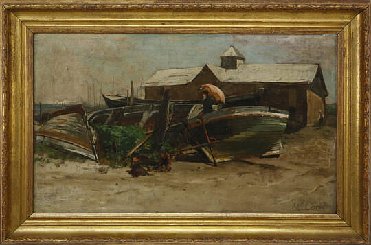 George Herbert McCord Oil on Canvas “Shipyard with Lady Under a Sun Umbrella”
