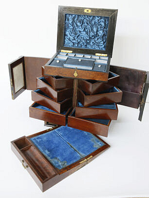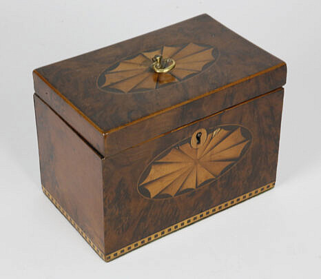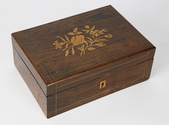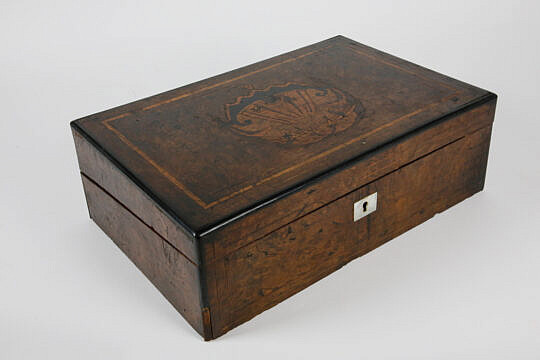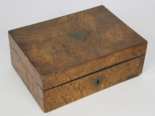 Burlwood Jewelry Box with Inlaid Brass Monogrammed Shield