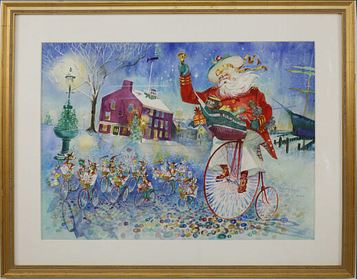 C. Robert Perrin Watercolor on Paper “Santa and His Reindeer on Main Street, Nantucket”