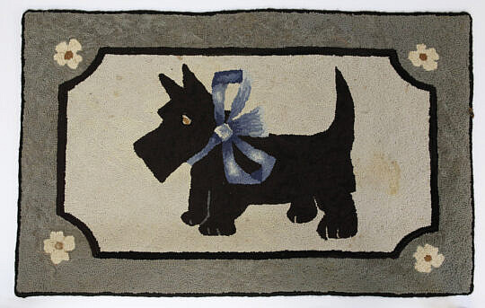 Scottie with Blue Bow Vintage Hand Hooked Rug
