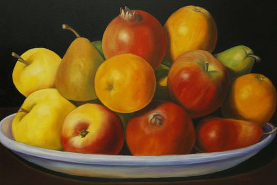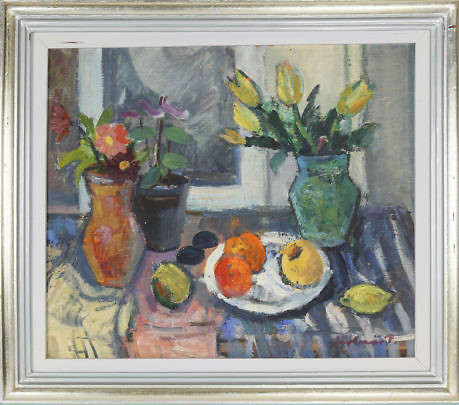 Moluat Pinoska Tulipan Oil on Masonite, “Table Top Fruit and Floral Still Life”