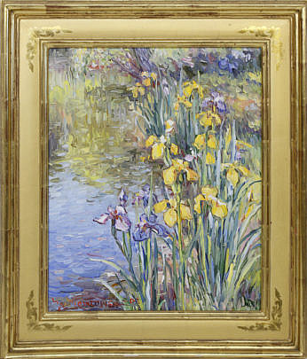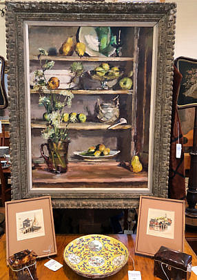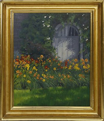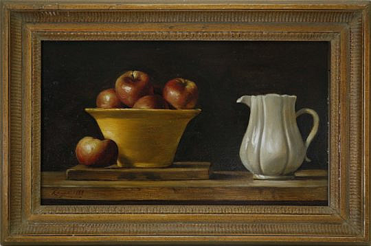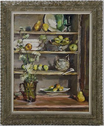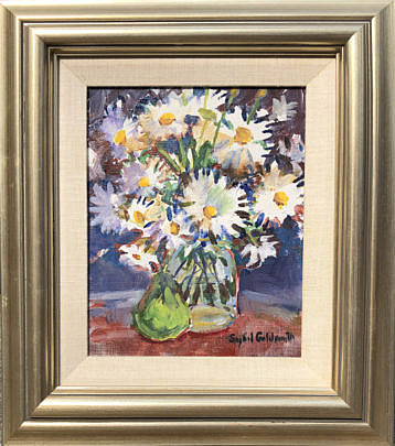 Sybil Goldsmith, Oil on Canvas, “Daisies in a Glass Jar and Green Pear”