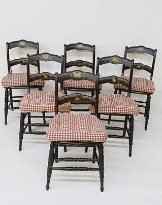 Six Country Decorated Caned Seat Chairs, 19th Century
