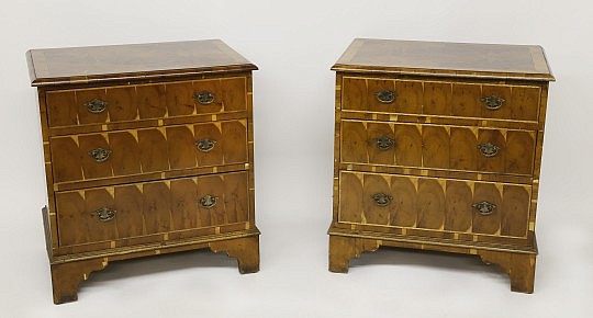 Pair of English Yew Wood Inlaid Three Drawer Diminutive Chests