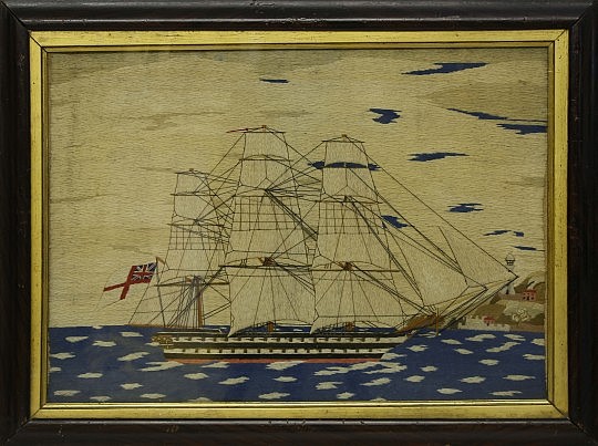 British Sailor’s Woolwork of an Unidentified Ship Approaching Lighthouse and Fort, 1856