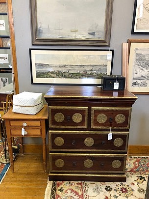 Engraved Brass Bound Teak Wood Two Over Two Chest of Drawers