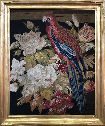 Large Antique Needlework Embroidery of a Parrot and Flowers