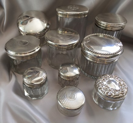 Group of Ten Various Cut Glass and Sterling Silver Topped Toiletry Boxes