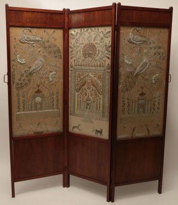 Anglo-Indian Gold and Silver Embroidery on Silk Three-Panel Room Screen