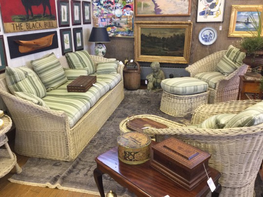 English Wicker Sofa, Armchairs and Round Side Tables