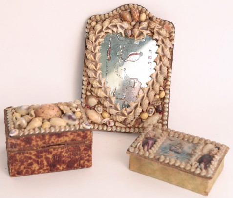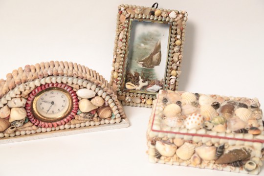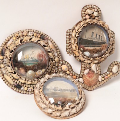 Three Victorian Shell Encrusted Plaques Depicting Ships