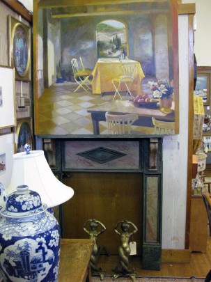 Faux Painted Marble Fireplace Surround & Mermaid Brass Andirons
