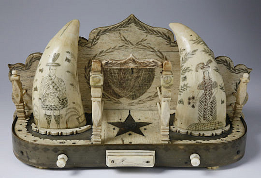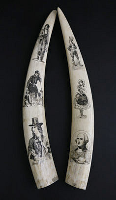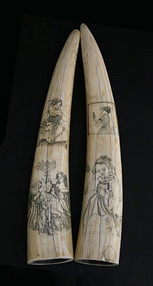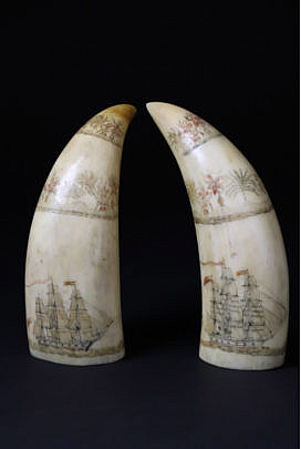 Pair of Antique Pictorial Scrimshaw Walrus Tusks, 2nd half of the 19th Century
