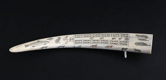 Judy Pelowook (Alaskan Eskimo) Scrimshaw Walrus Tusk Cribbage Board, circa 1970s