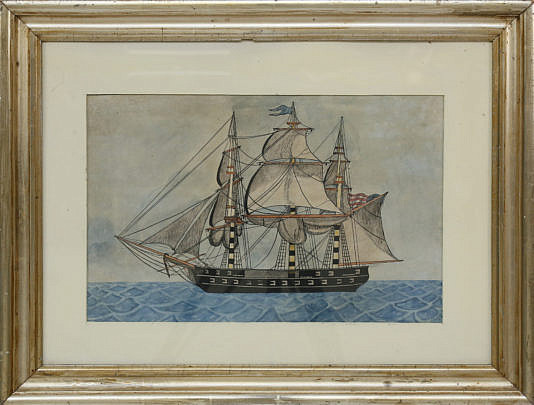 American Watercolor “Portrait of a Three-Masted Gunboat”
