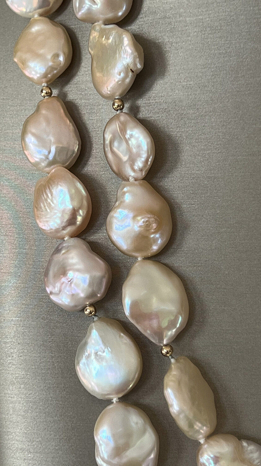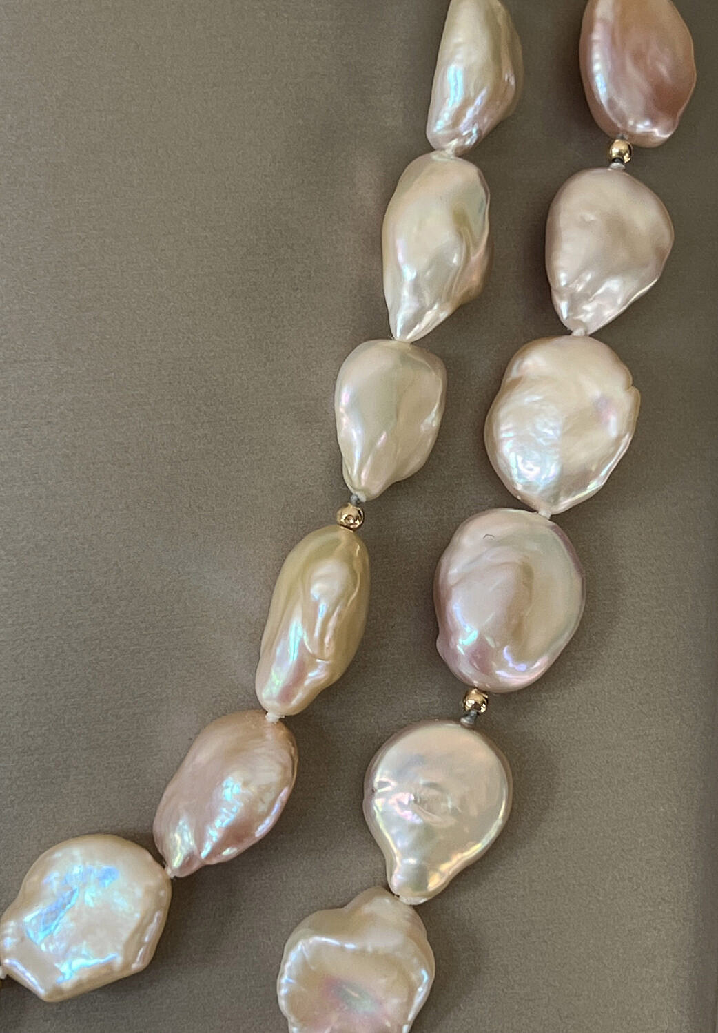 15mm – 19mm Peach Fresh Water Baroque Pearl Necklace SizeLength 48 in.Ref #39400 15mm – 19mm Peach Fresh Water Baroque Pearl Necklace with sterling silver accent beads, pictured doubled up Length 48 in. This item has been sold. X Visit our BUY IT NOW collection - frequent new additions ENTER