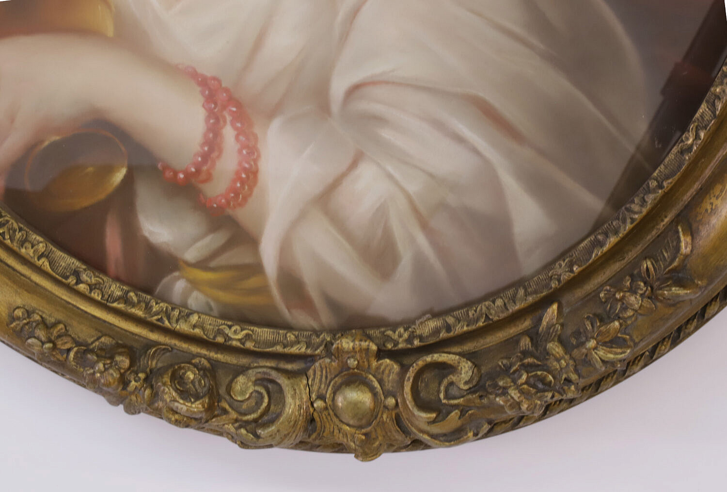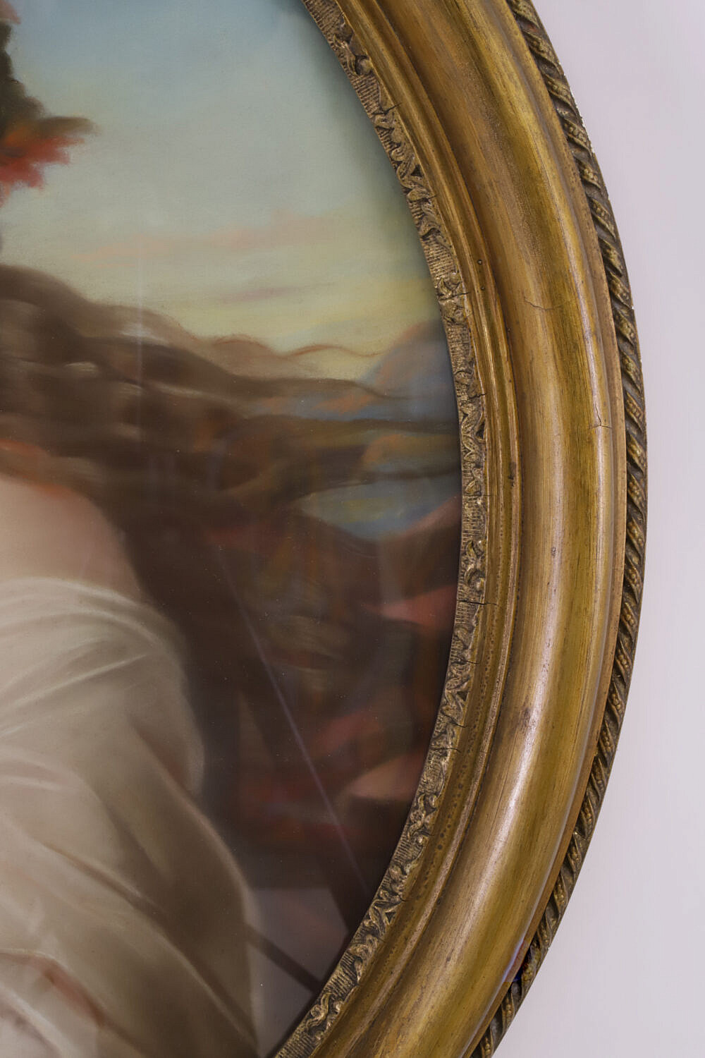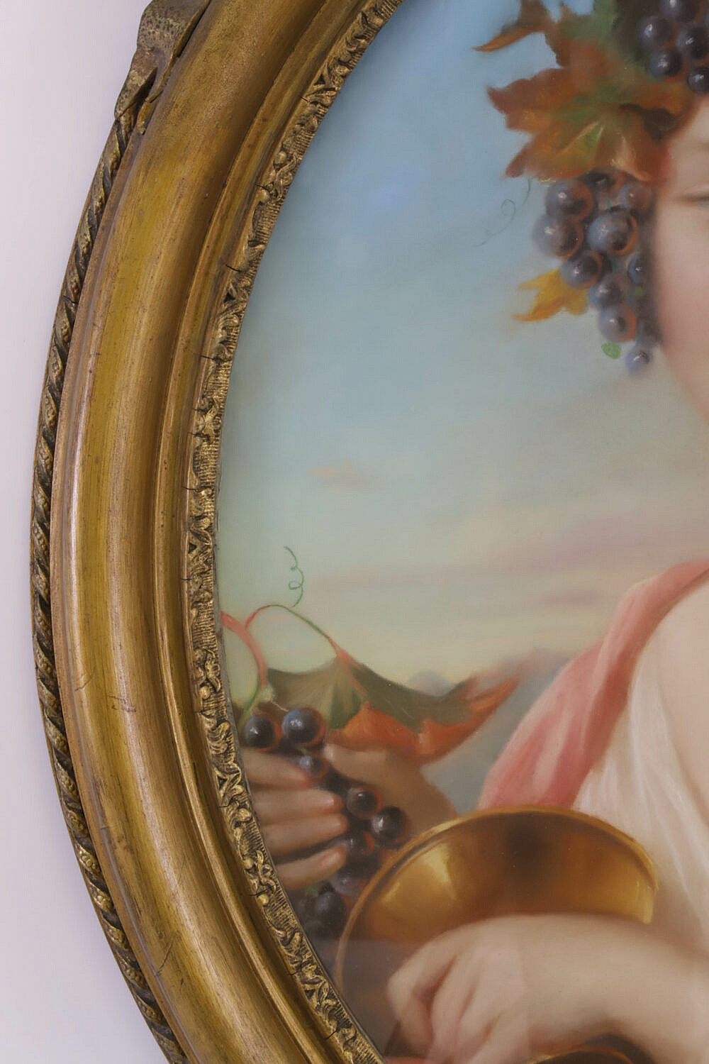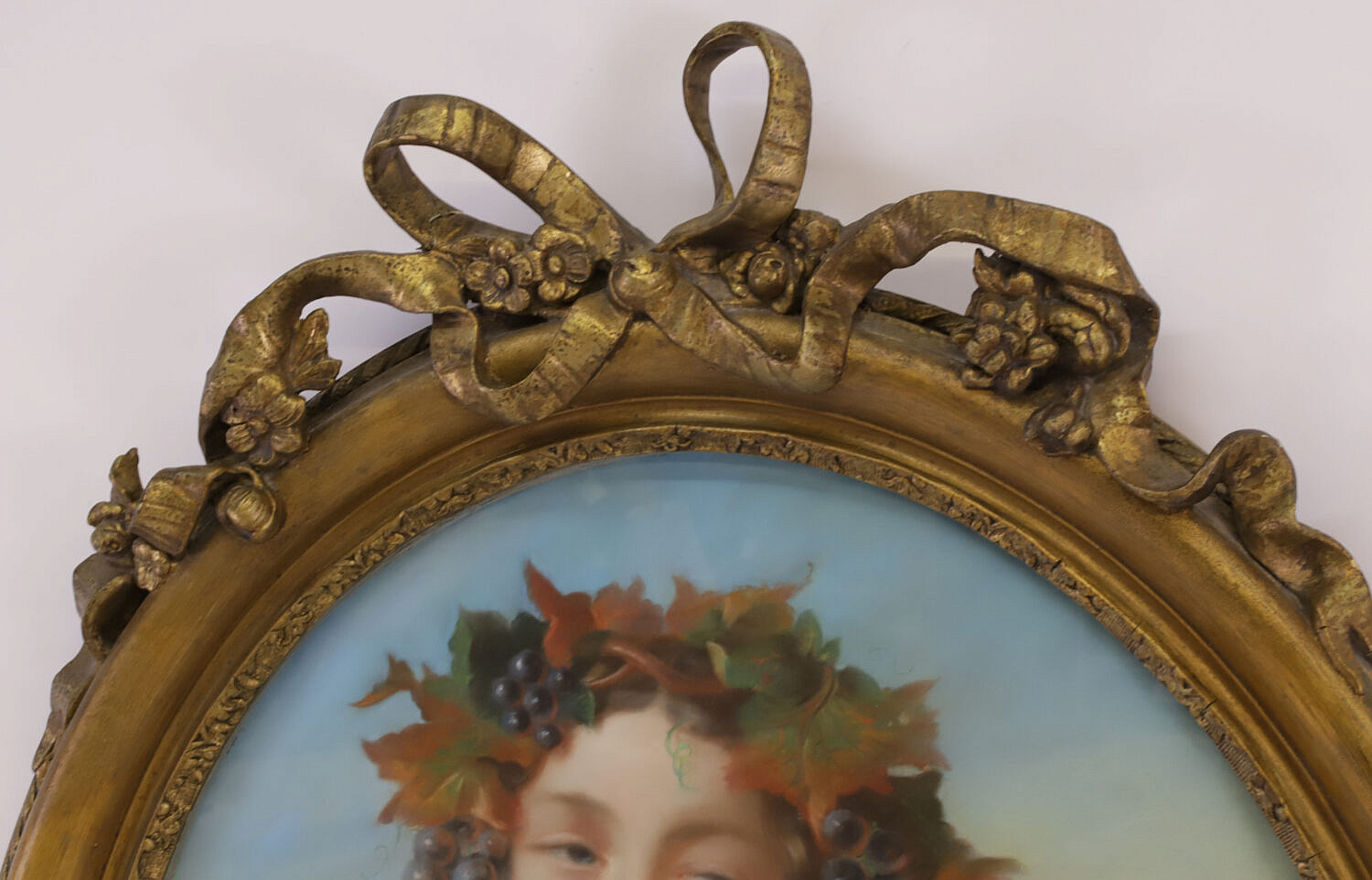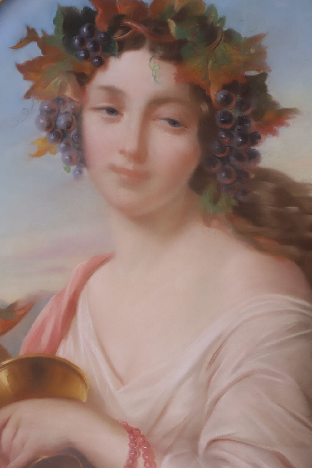 Antique Pastel Portrait of a Young Woman Wearing A Bacchus Crown and Holding a Cluster of Grapes in Elaborately Carved Frame