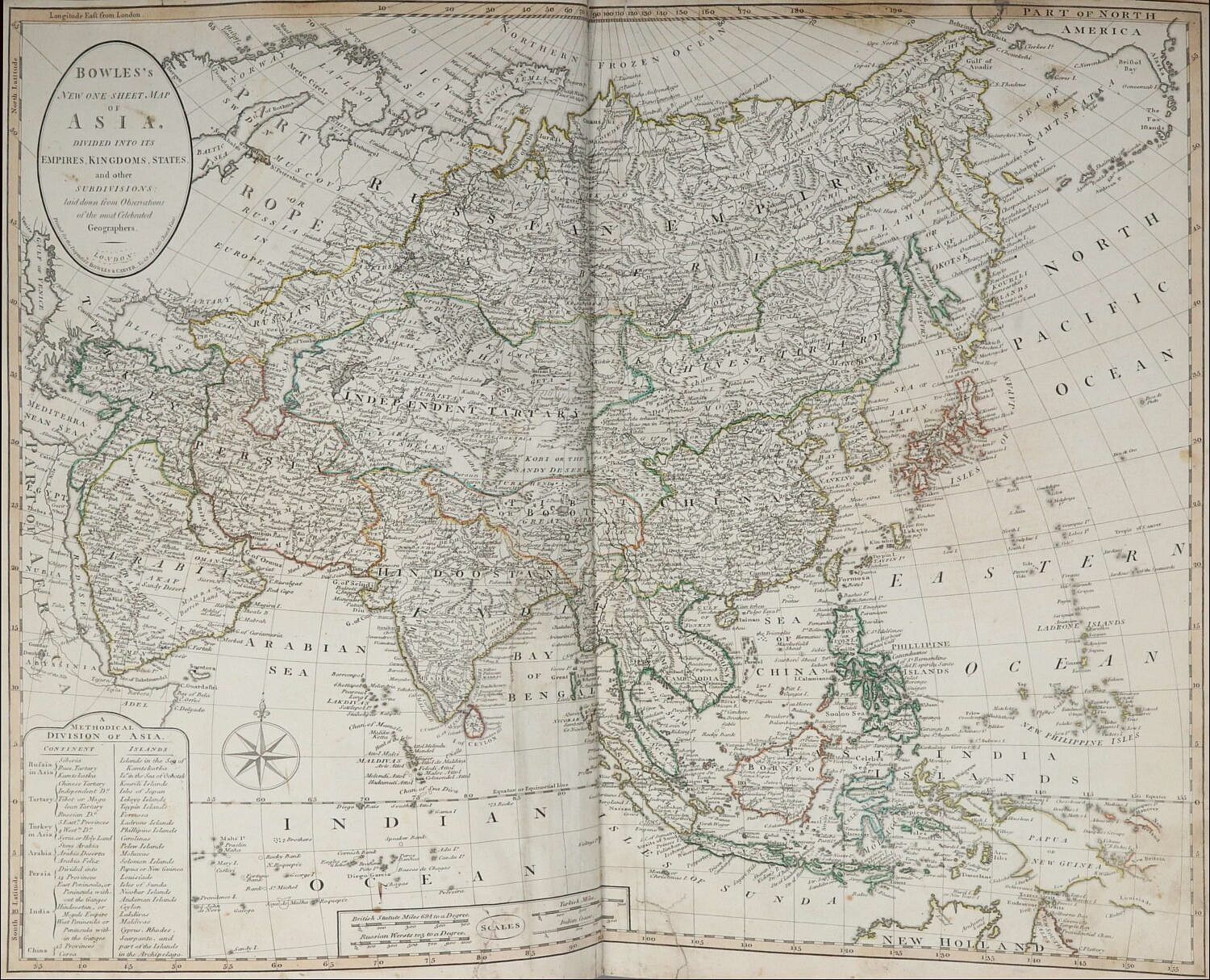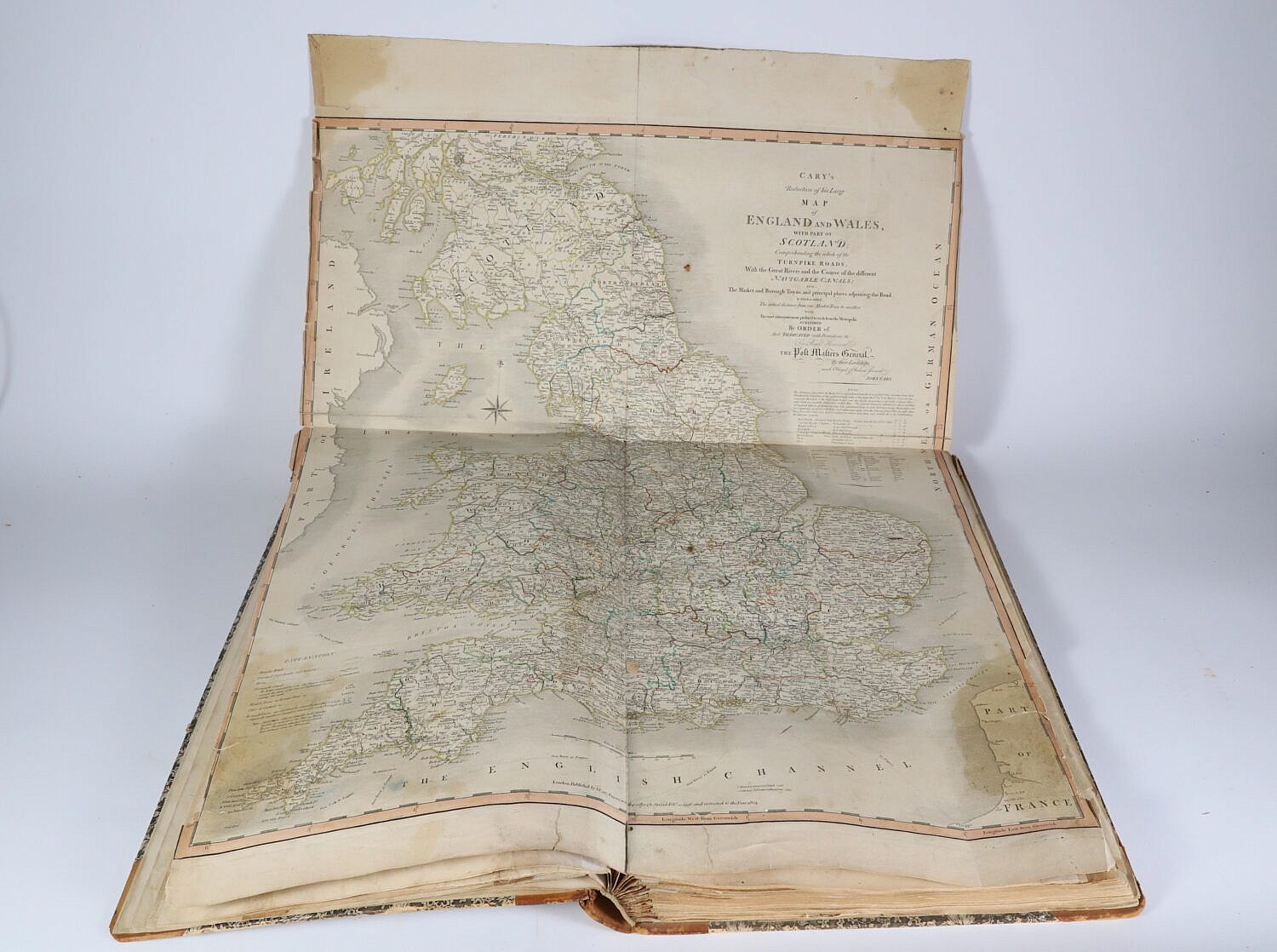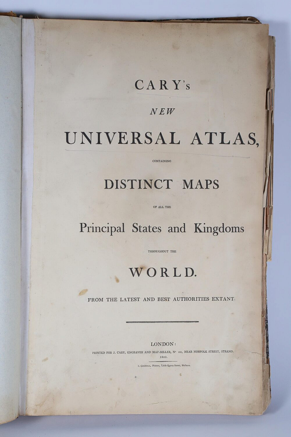 Cary’s New Universal Atlas with 32 Handcolored Maps by John Cary (dated 1799 and 1801), of one or two sheets, folded; bound together with 4 maps of the Continents (Africa, Asia, Europe and America) by Bowles, London circa 1794-98; a New Map of Persia by D’Anville, London 1794; A two hemisphere map by I.P Spehr, Braunschewig; Folio, half-calf with printed boards; worn, used, stains, some marginal tears.