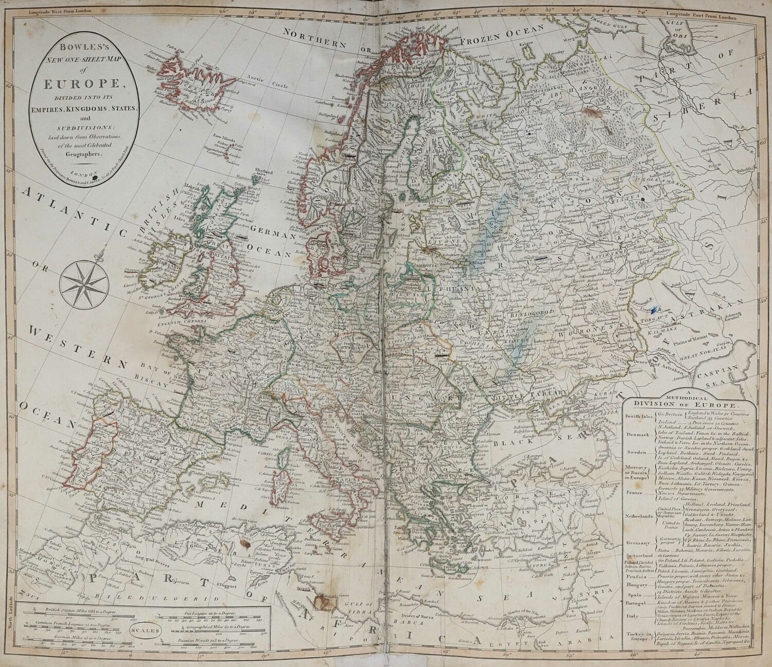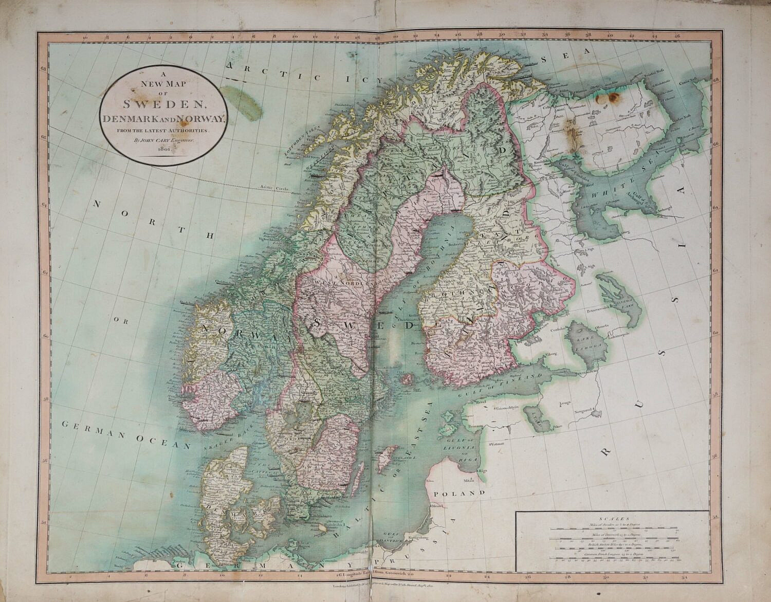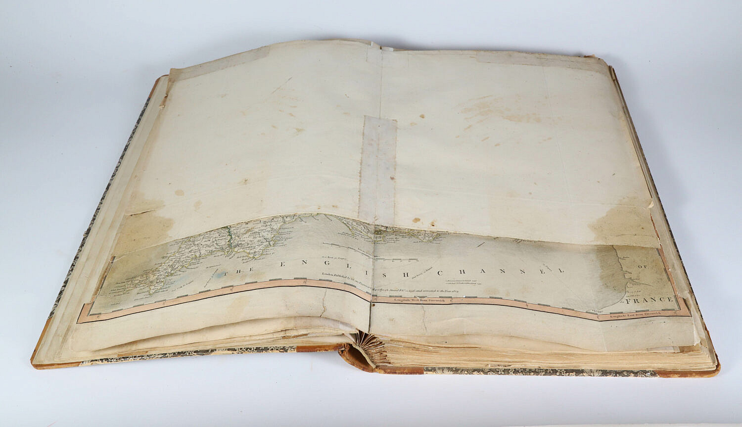 Cary’s New Universal Atlas with 32 Handcolored Maps by John Cary (dated 1799 and 1801), of one or two sheets, folded; bound together with 4 maps of the Continents (Africa, Asia, Europe and America) by Bowles, London circa 1794-98; a New Map of Persia by D’Anville, London 1794; A two hemisphere map by I.P Spehr, Braunschewig; Folio, half-calf with printed boards; worn, used, stains, some marginal tears.