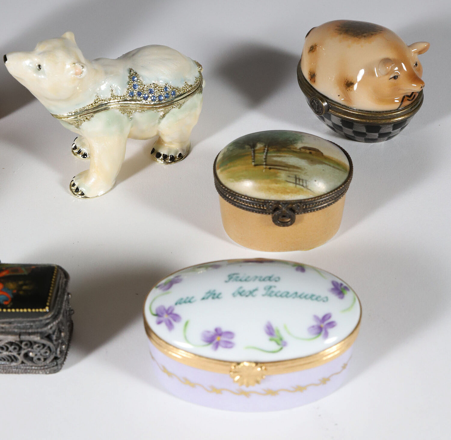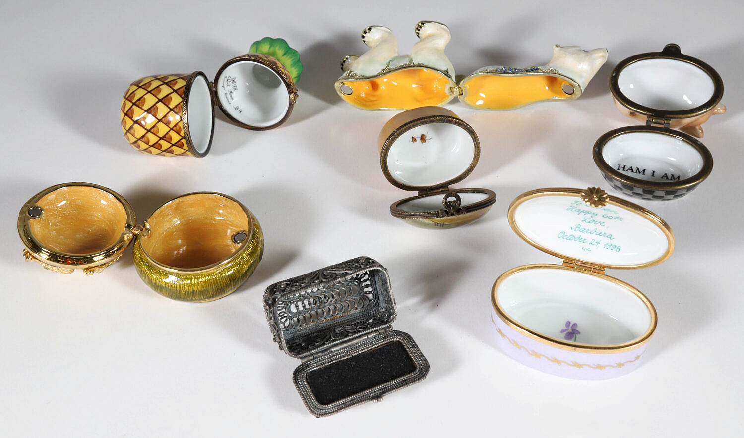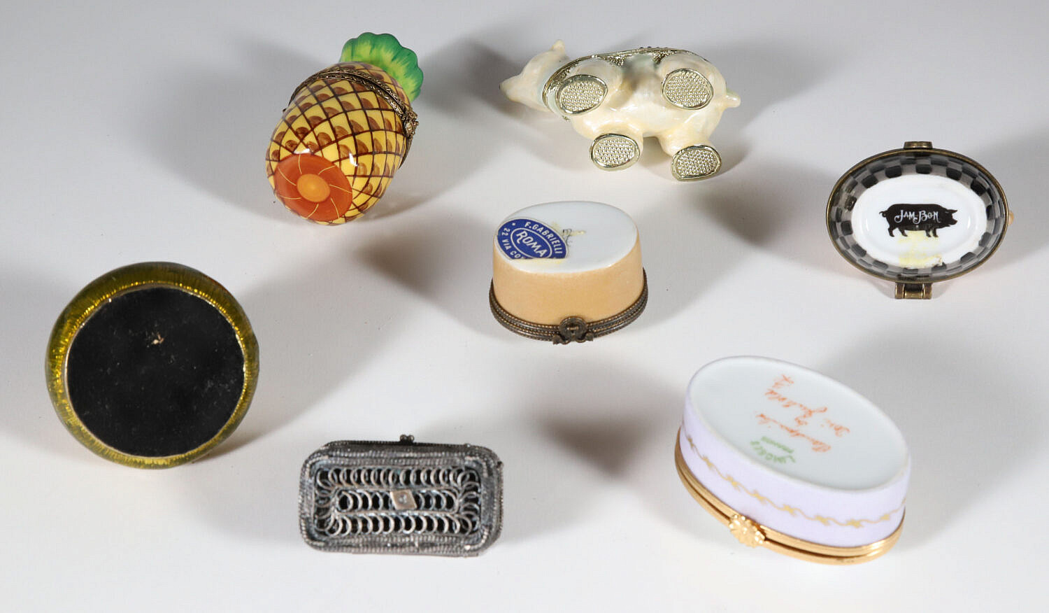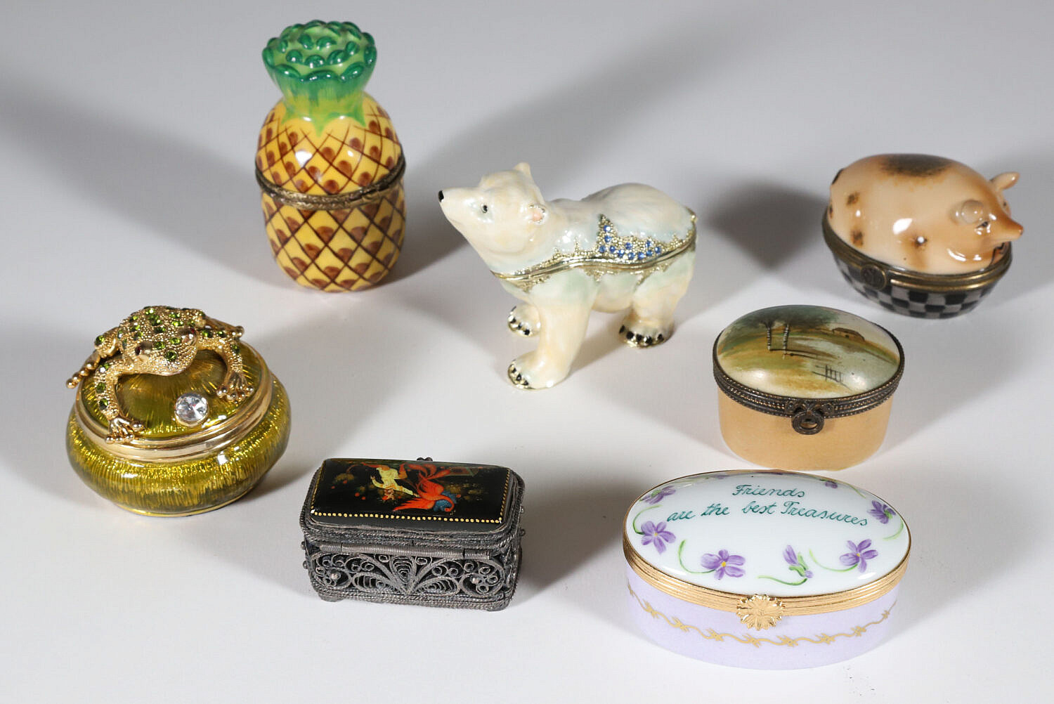Collection of Seven Miscellaneous Pill Boxes SizeLengths 2 in. to 3 in.Ref #323-5515 Collection of Seven Miscellaneous Pill Boxes, including one Limoges box Lengths 2 in. to 3 in. Provenance: Collection of Susan Akers, 7 Pleasant Street, Nantucket Island, Massachusetts This item has been sold. X Visit our BUY IT NOW collection - frequent new additions ENTER