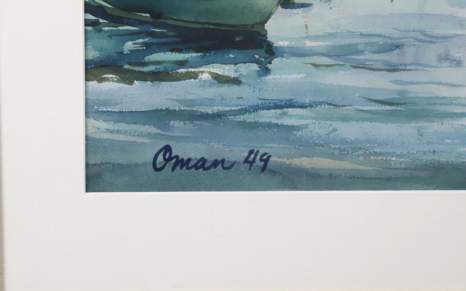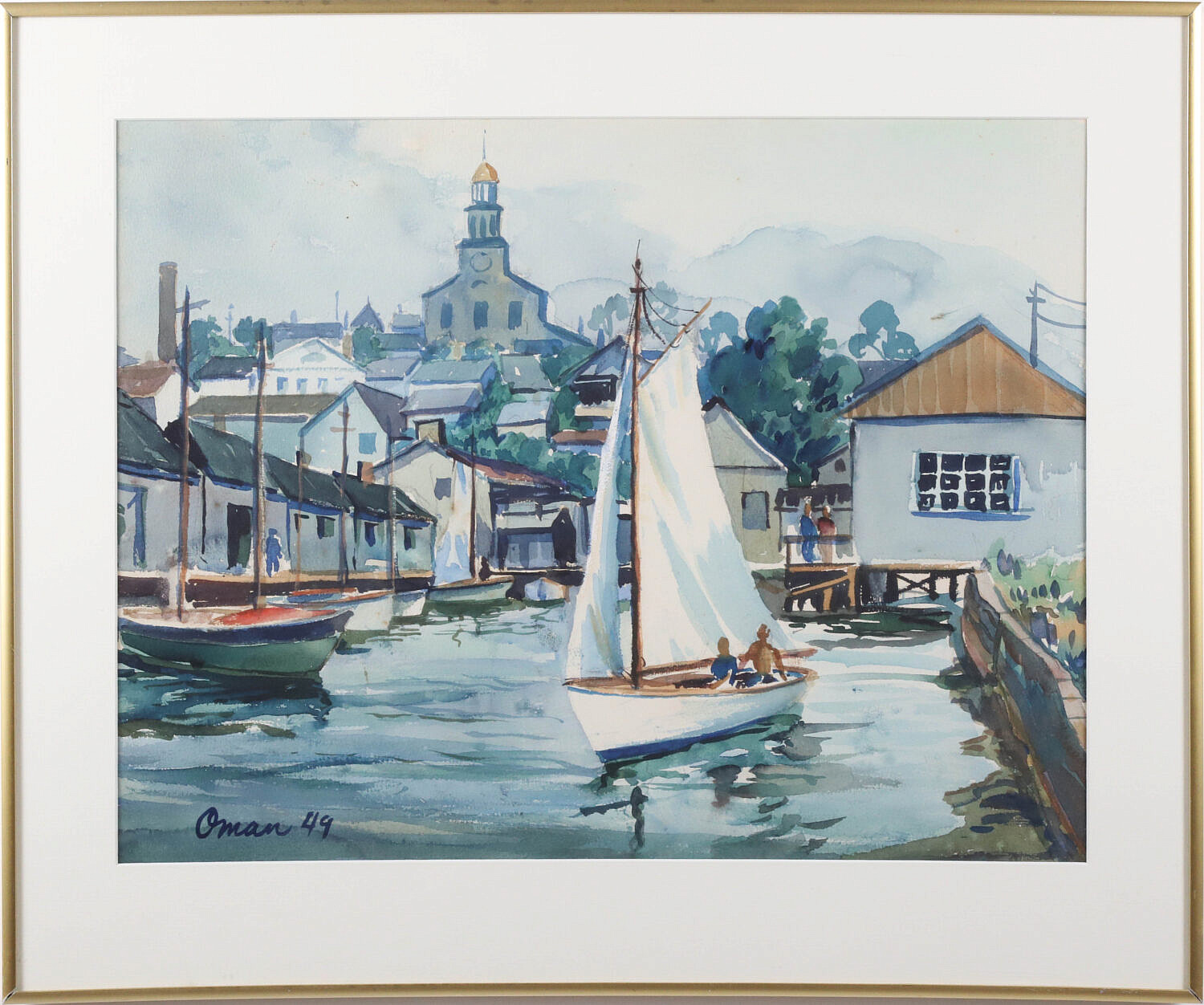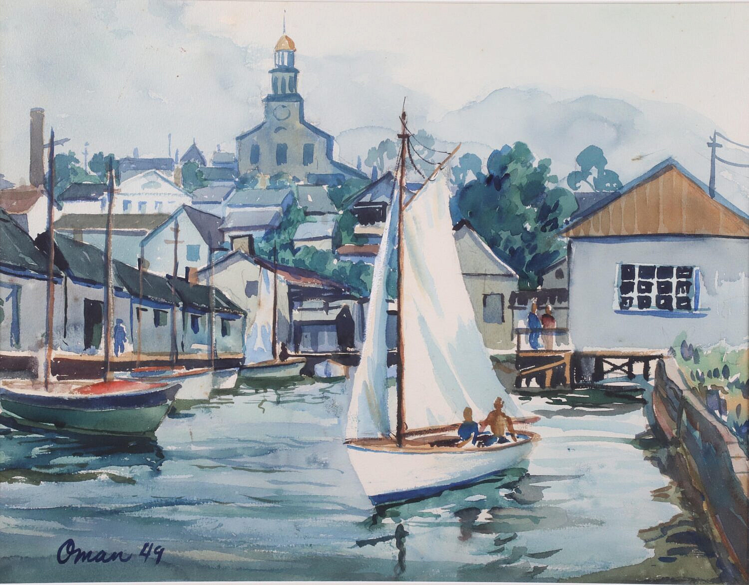 Edwin Oman Watercolor on Paper “Sailing Out of Nantucket Harbor”