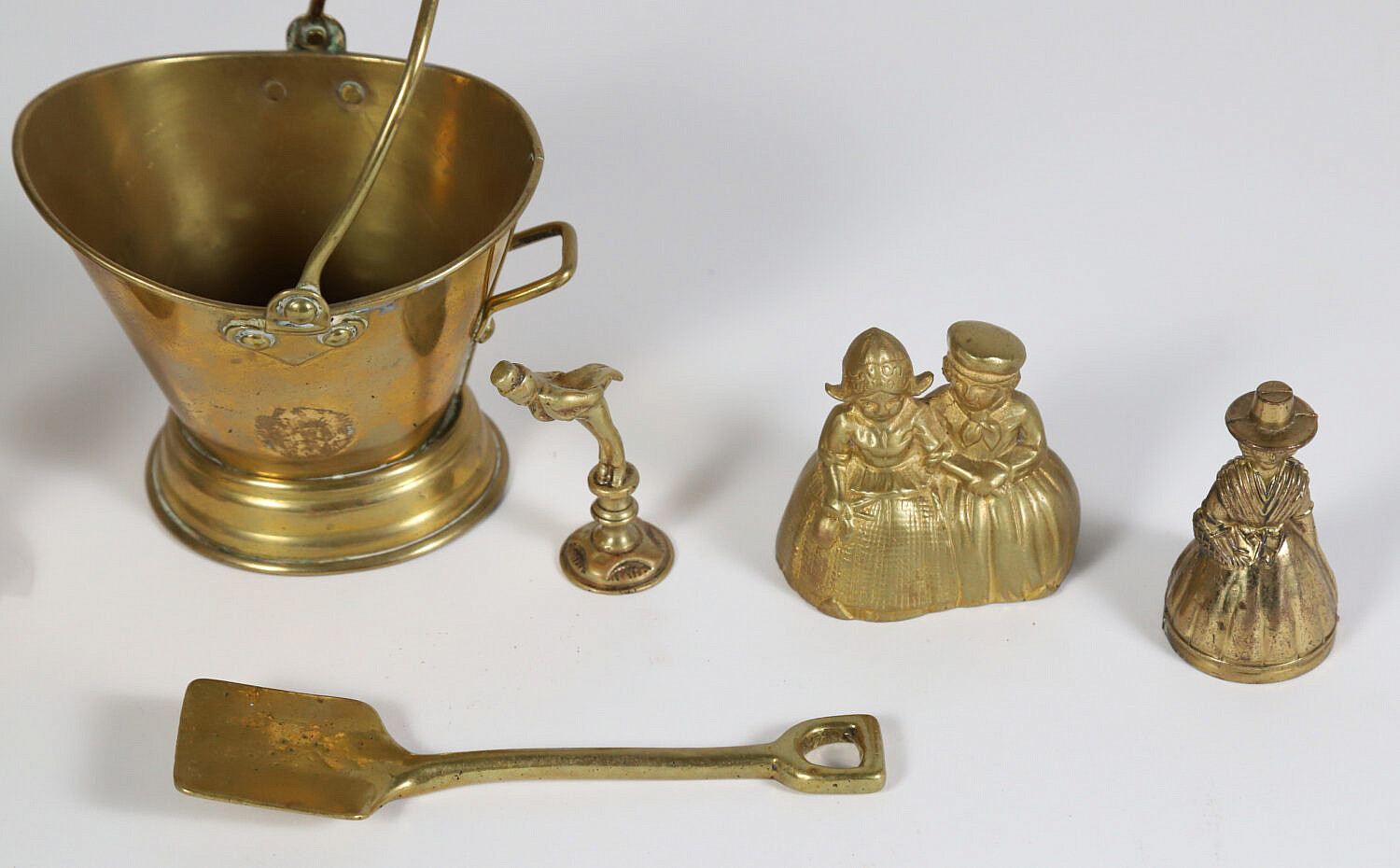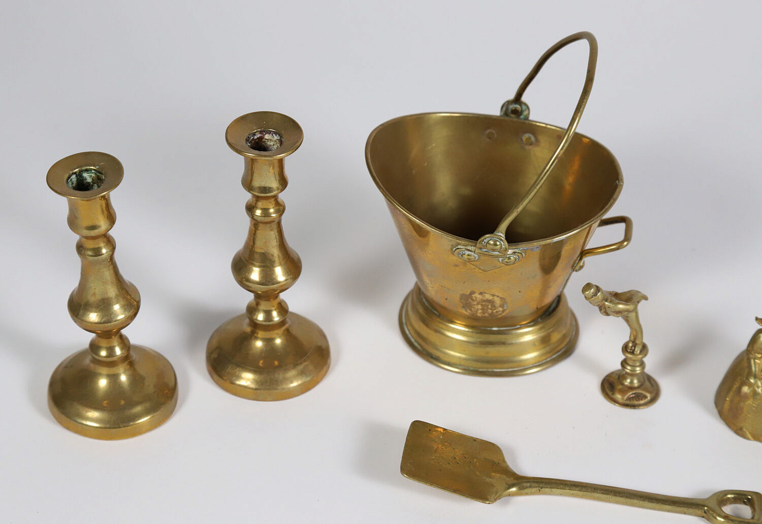 Group Of Brass Goods: Candlesticks, Two Figural Dinner Bells, Kindling Match Bucket, Shovel