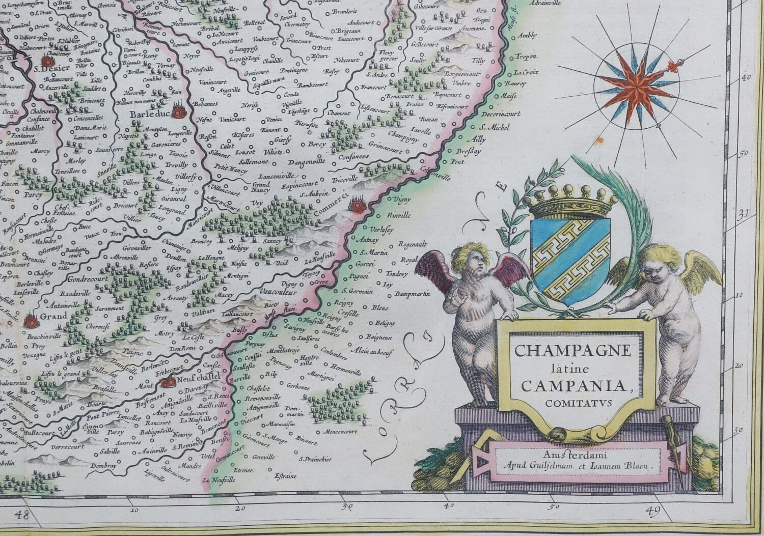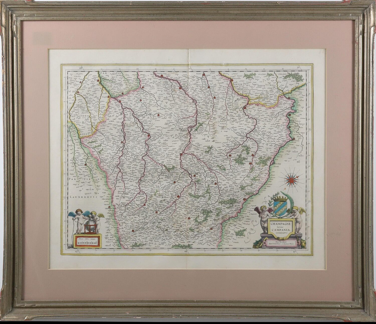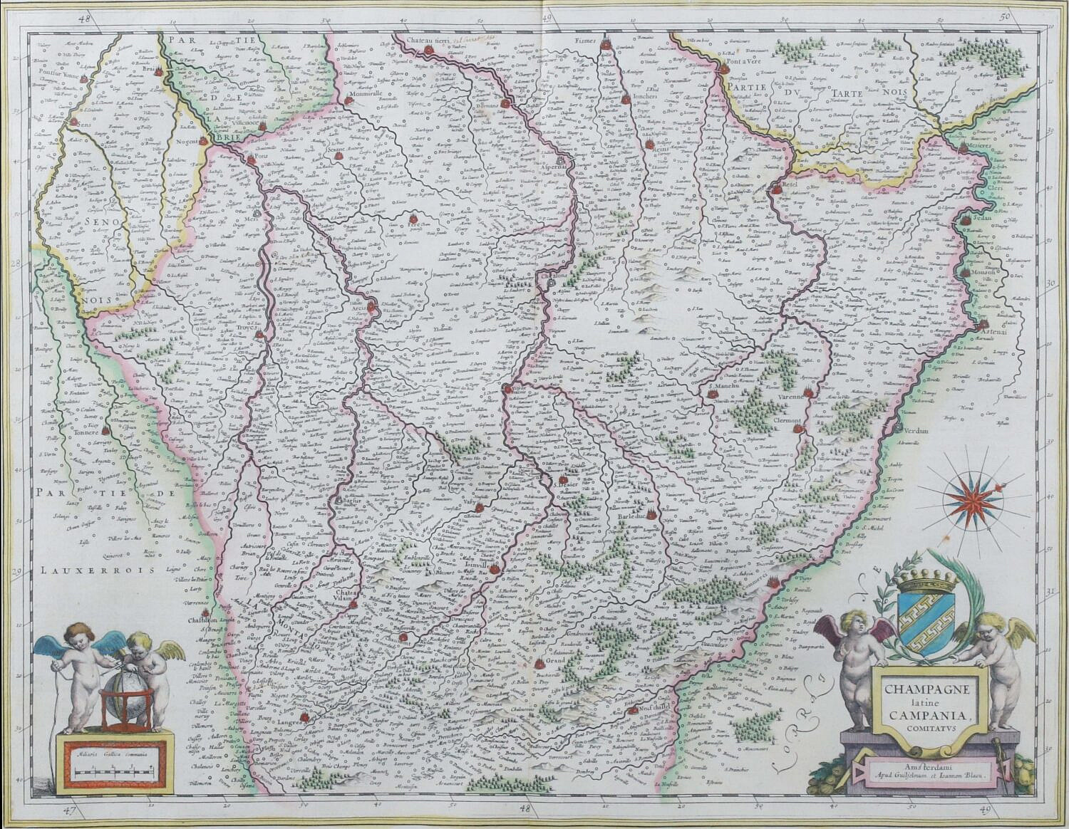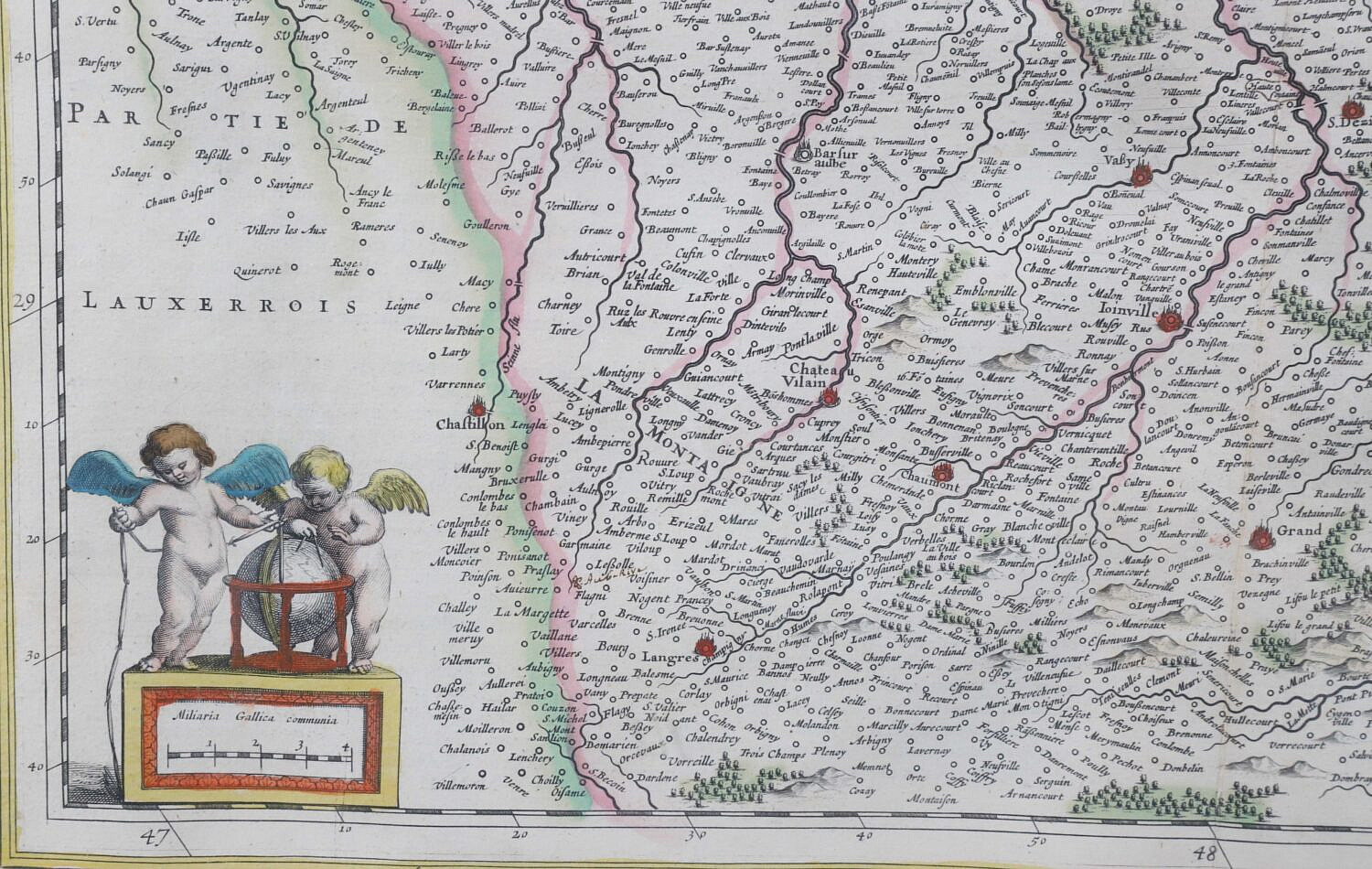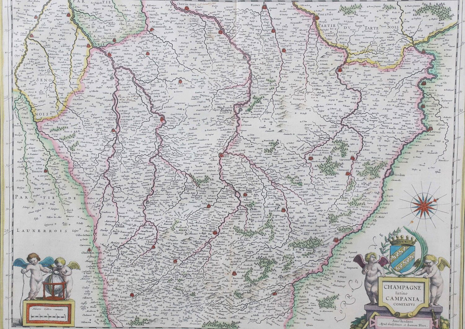 Hand Colored Copper Plate Engraving Map “Champagne latine Campania Comitatvs” circa 1645