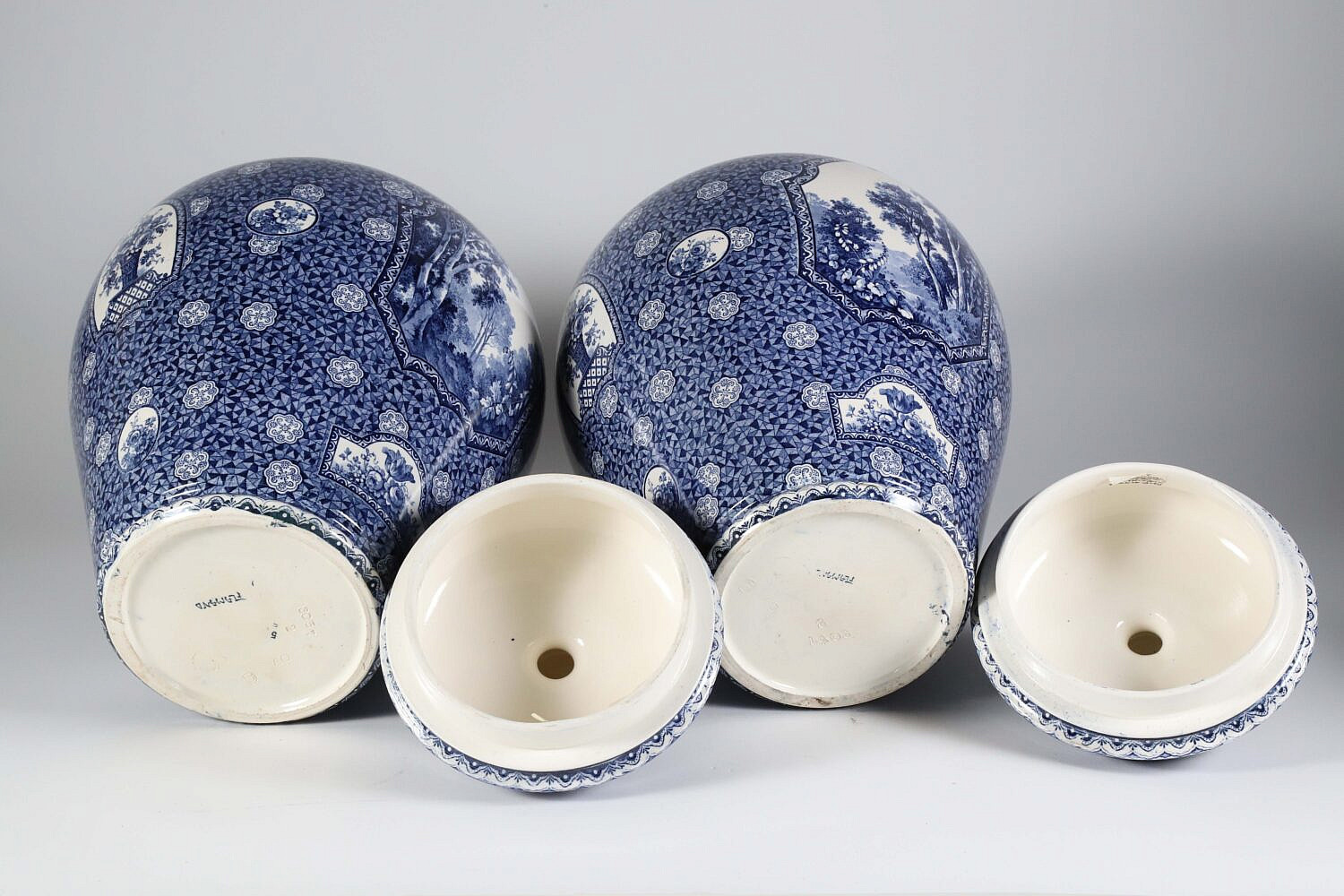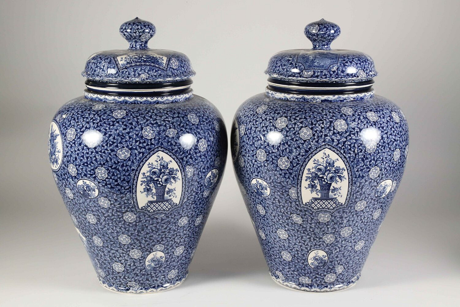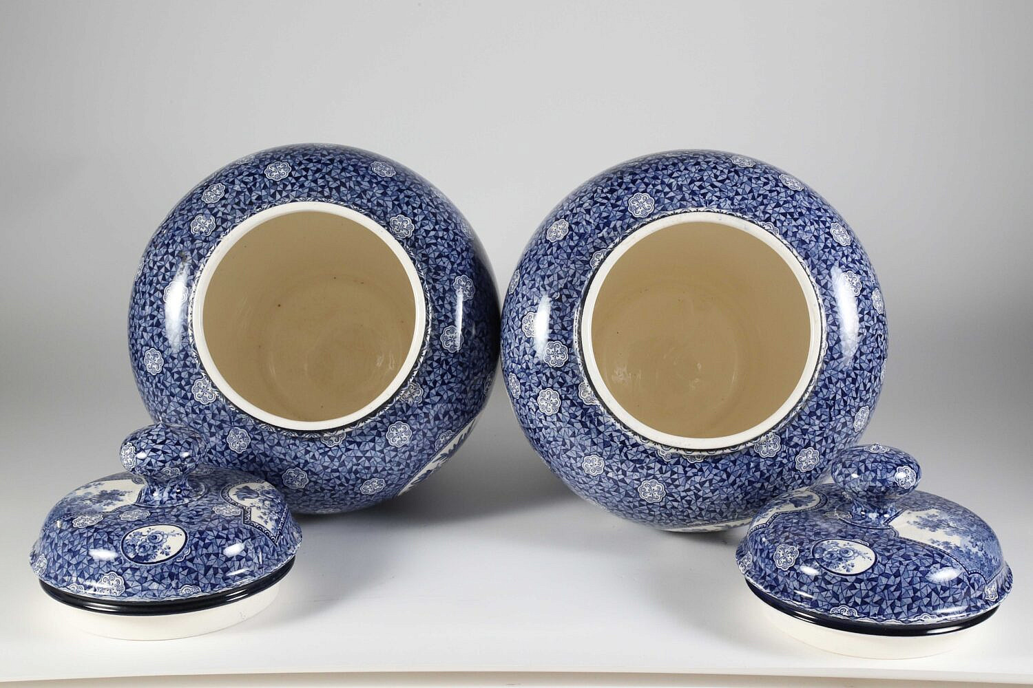 Pair of Antique Flamand Blue and White Transferware Covered Jars