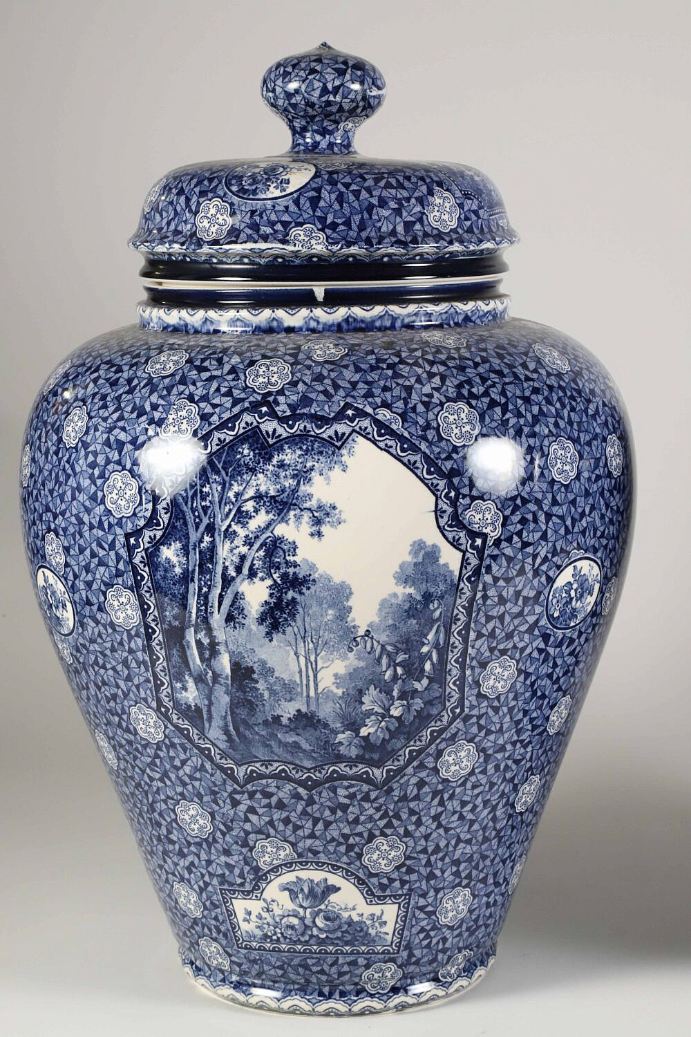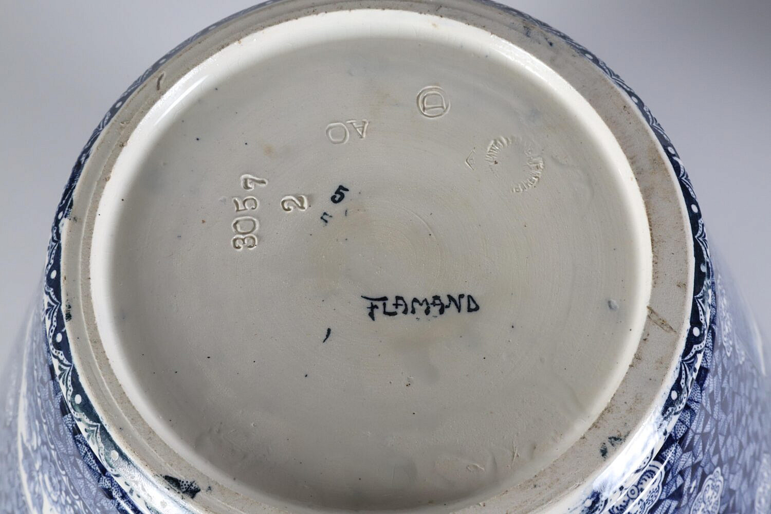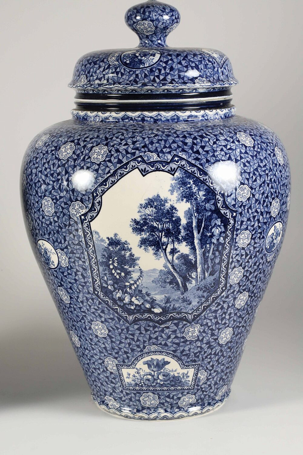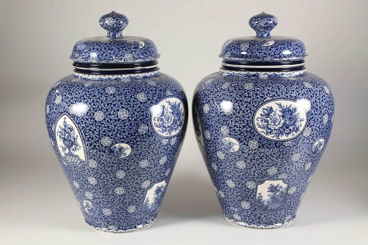 Pair of Antique Flamand Blue and White Transferware Covered Jars