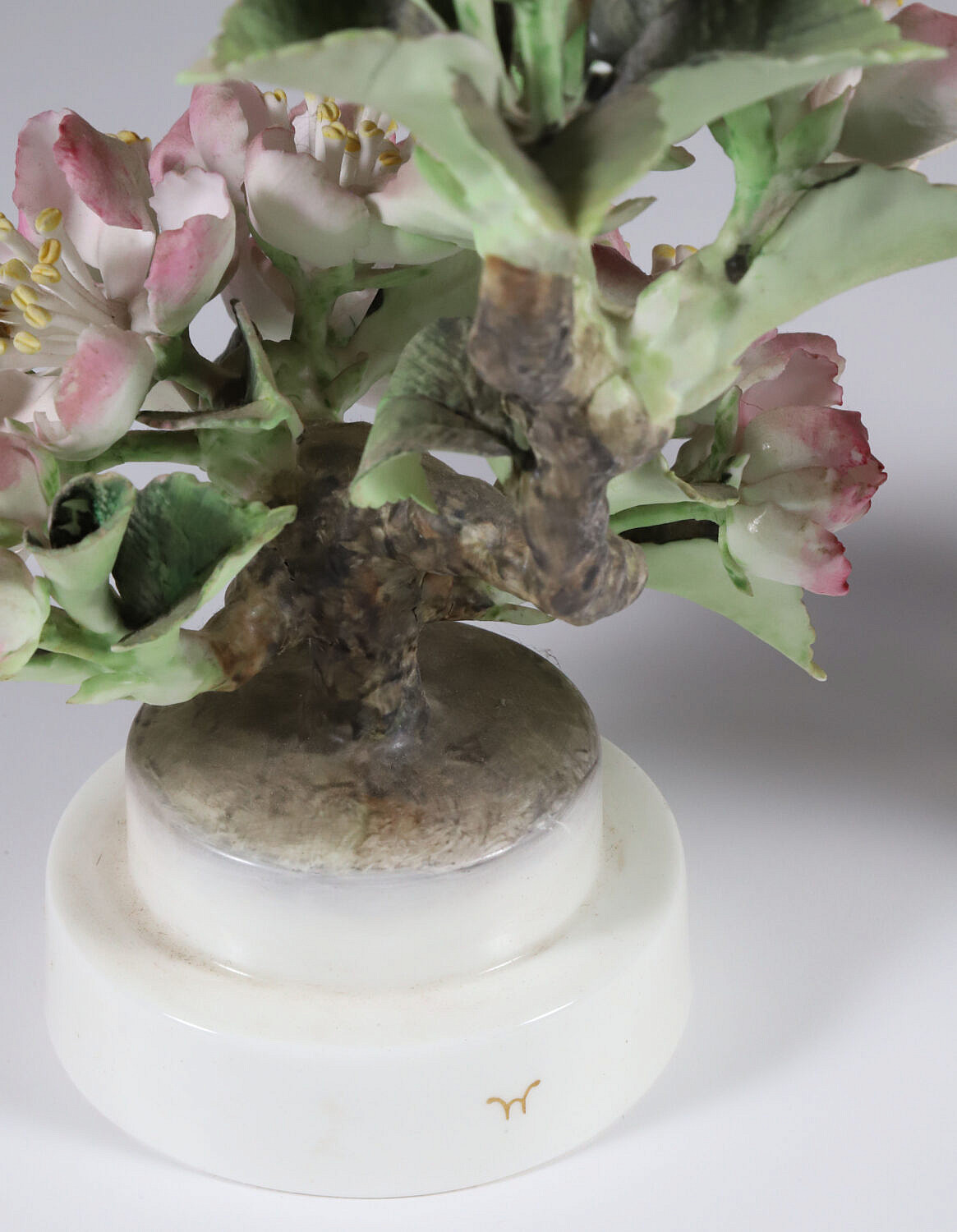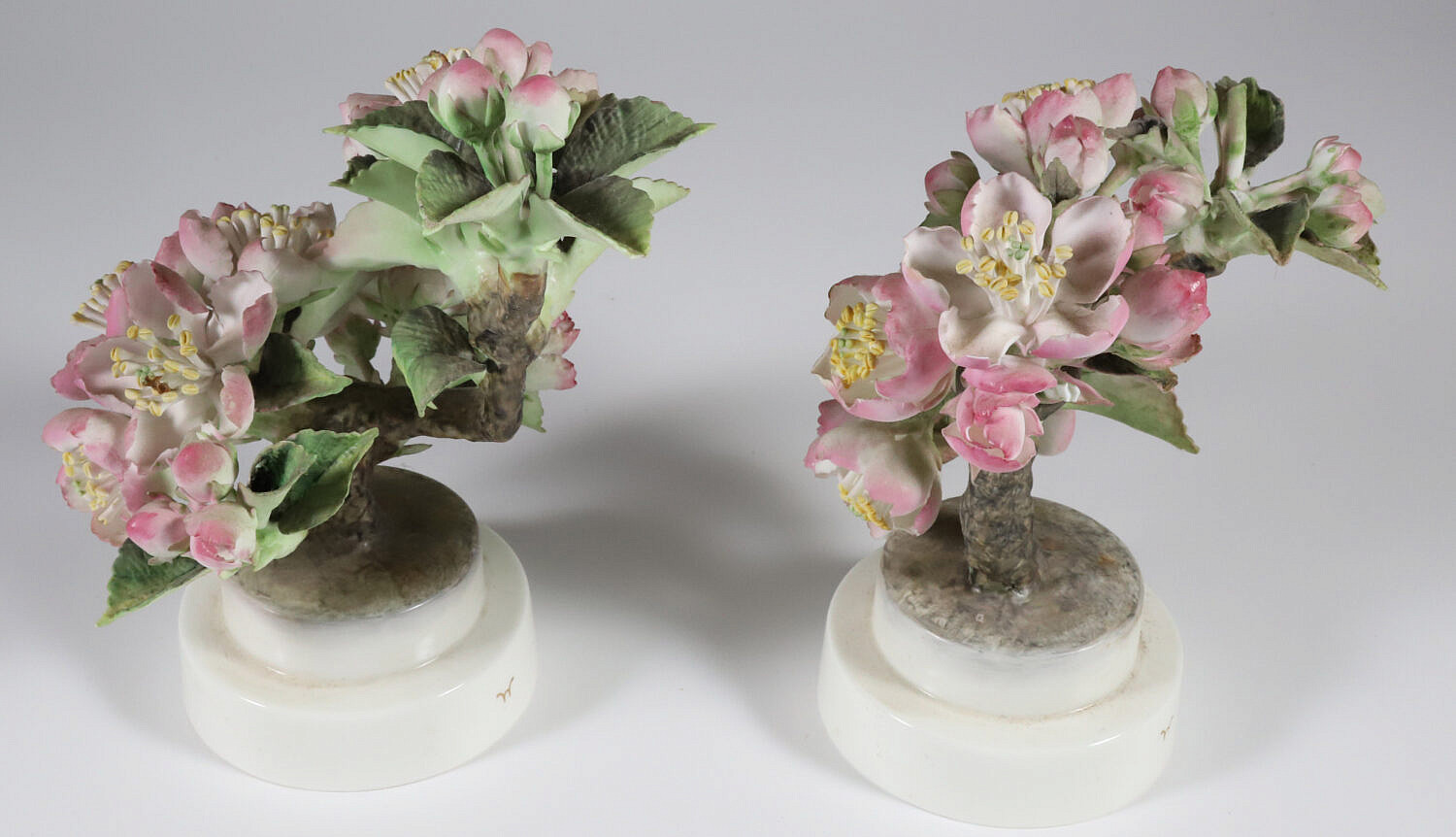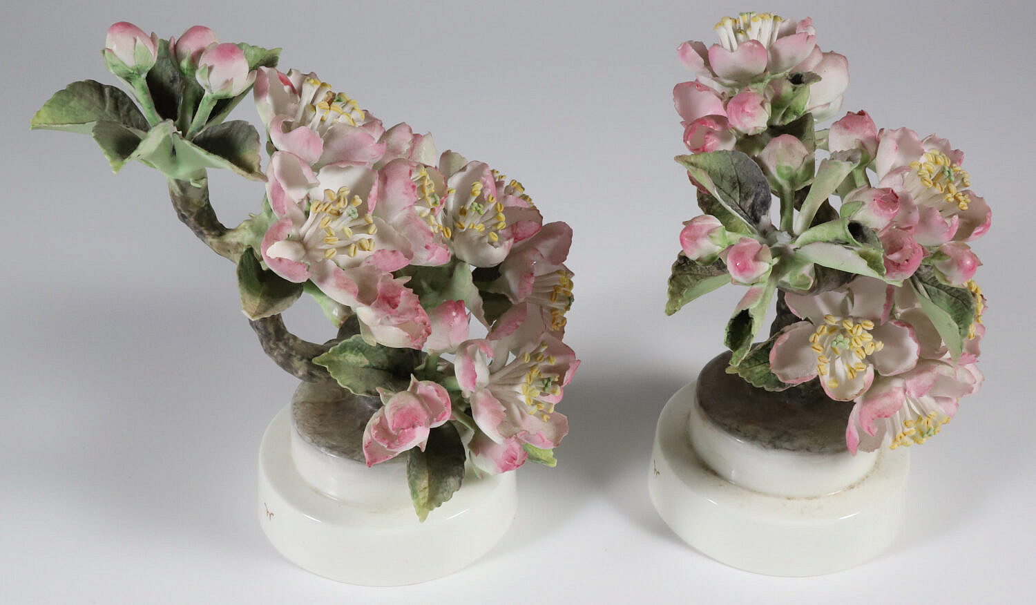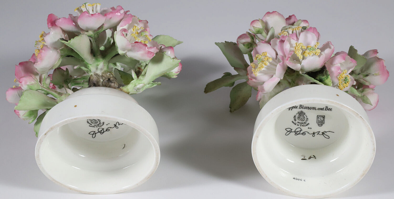 Pair of Royal Worcester Porcelain Apple Blossom and Bee Sculptures