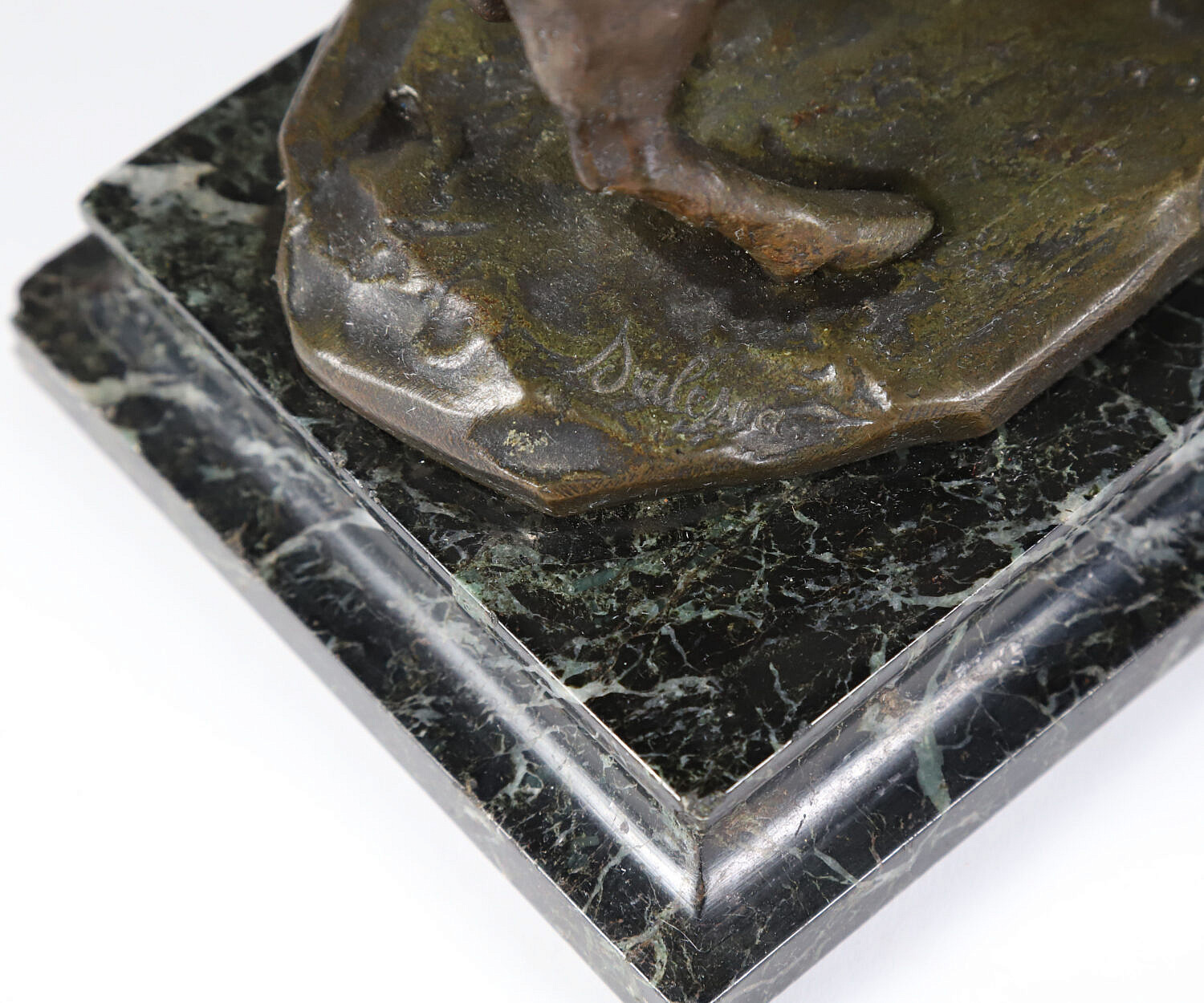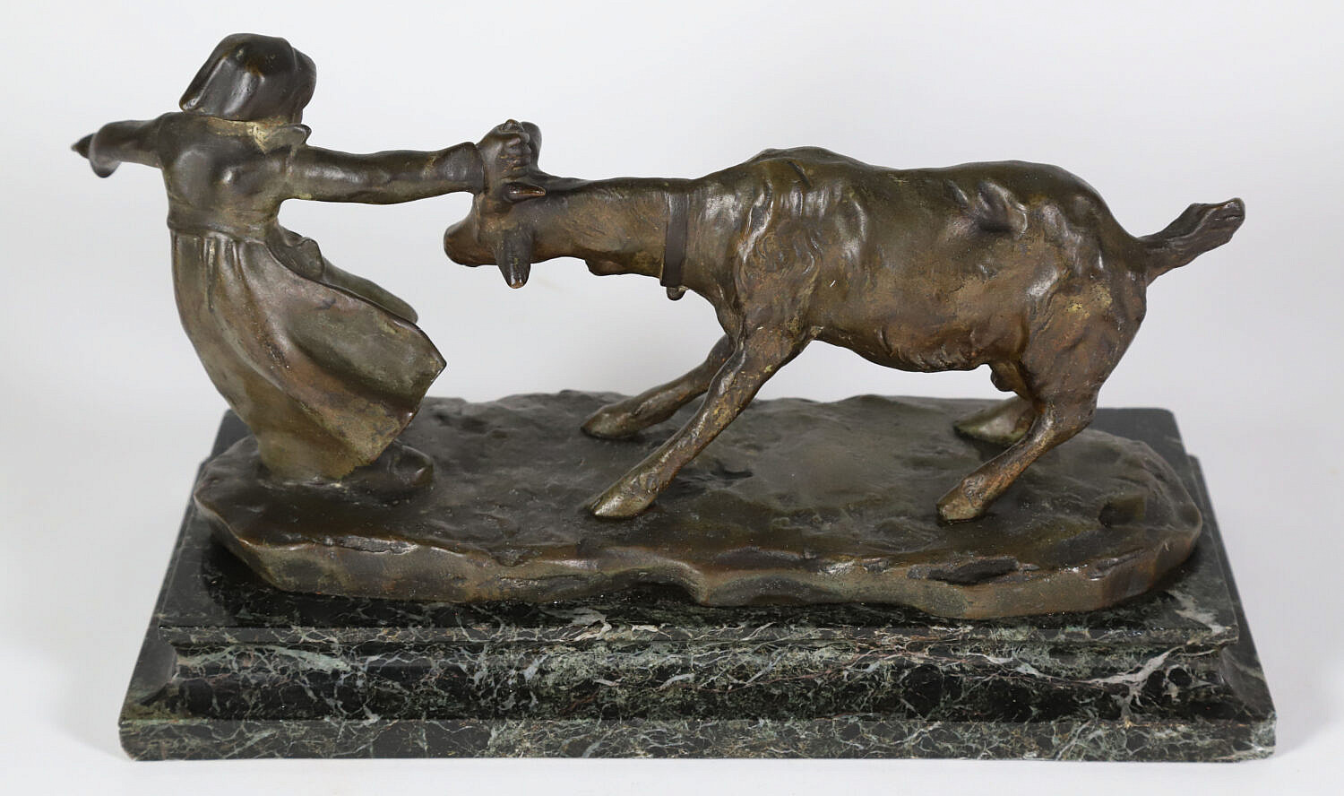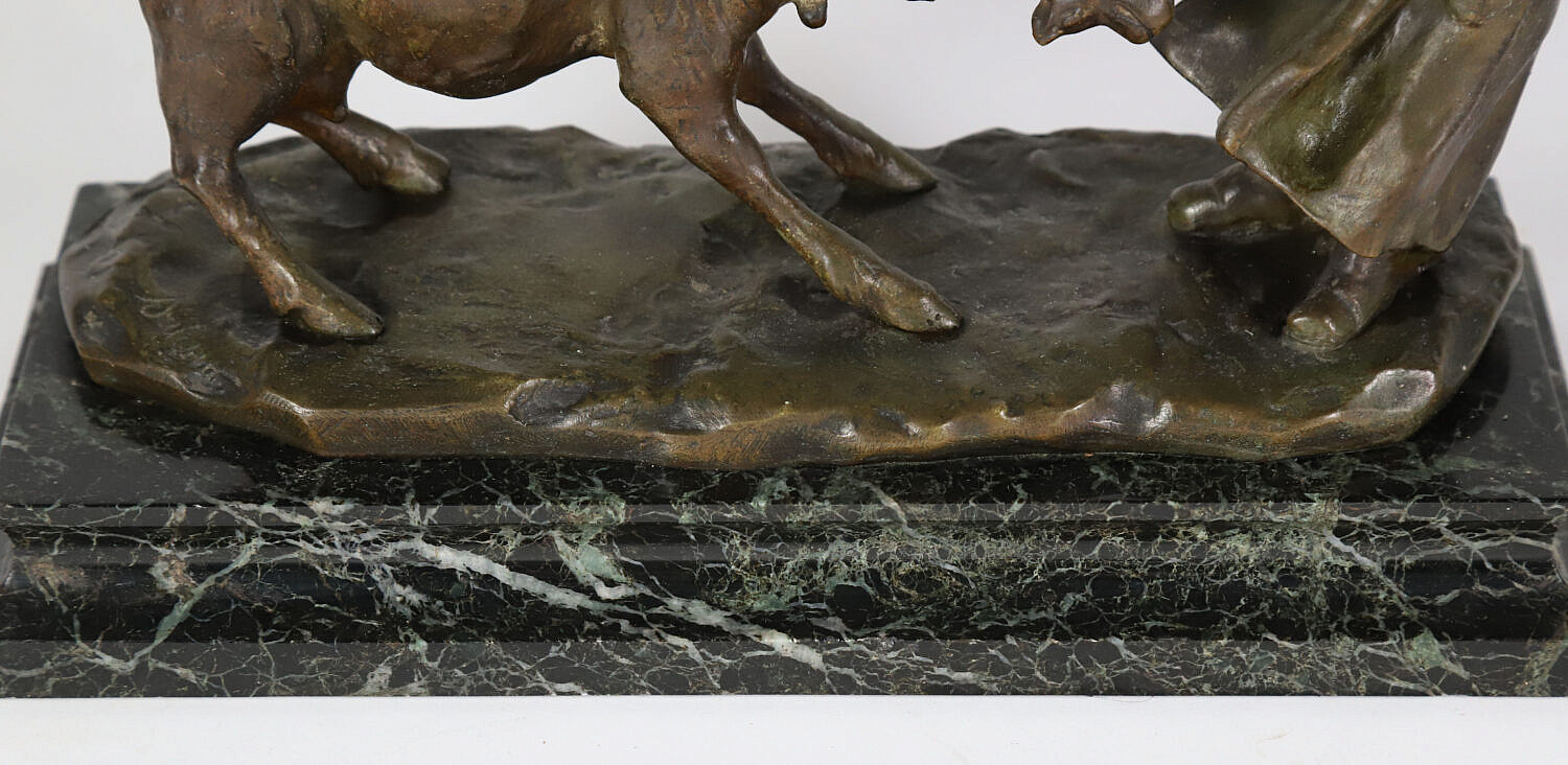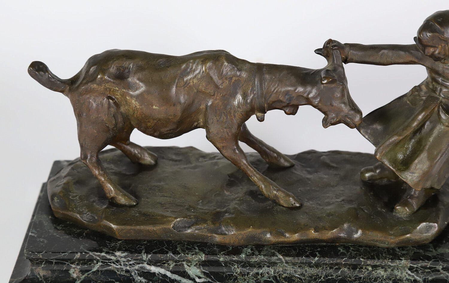 Signed Cast Bronze Figural Group of a Young Dutch Girl and a Goat on Stepped Marble Base