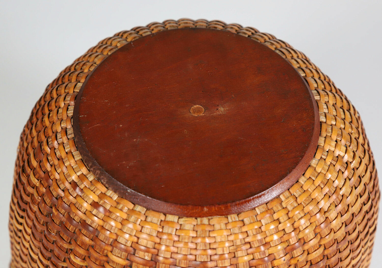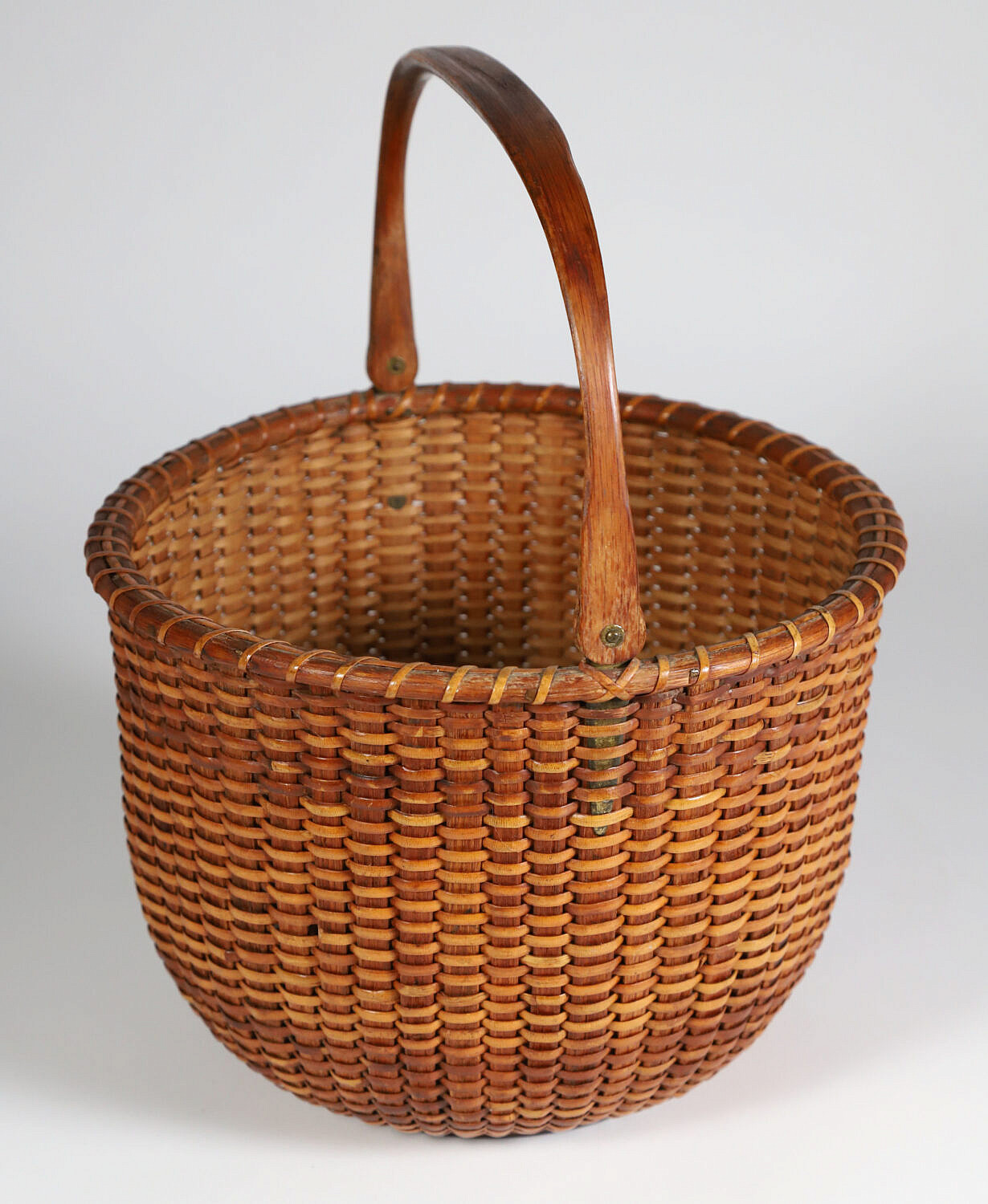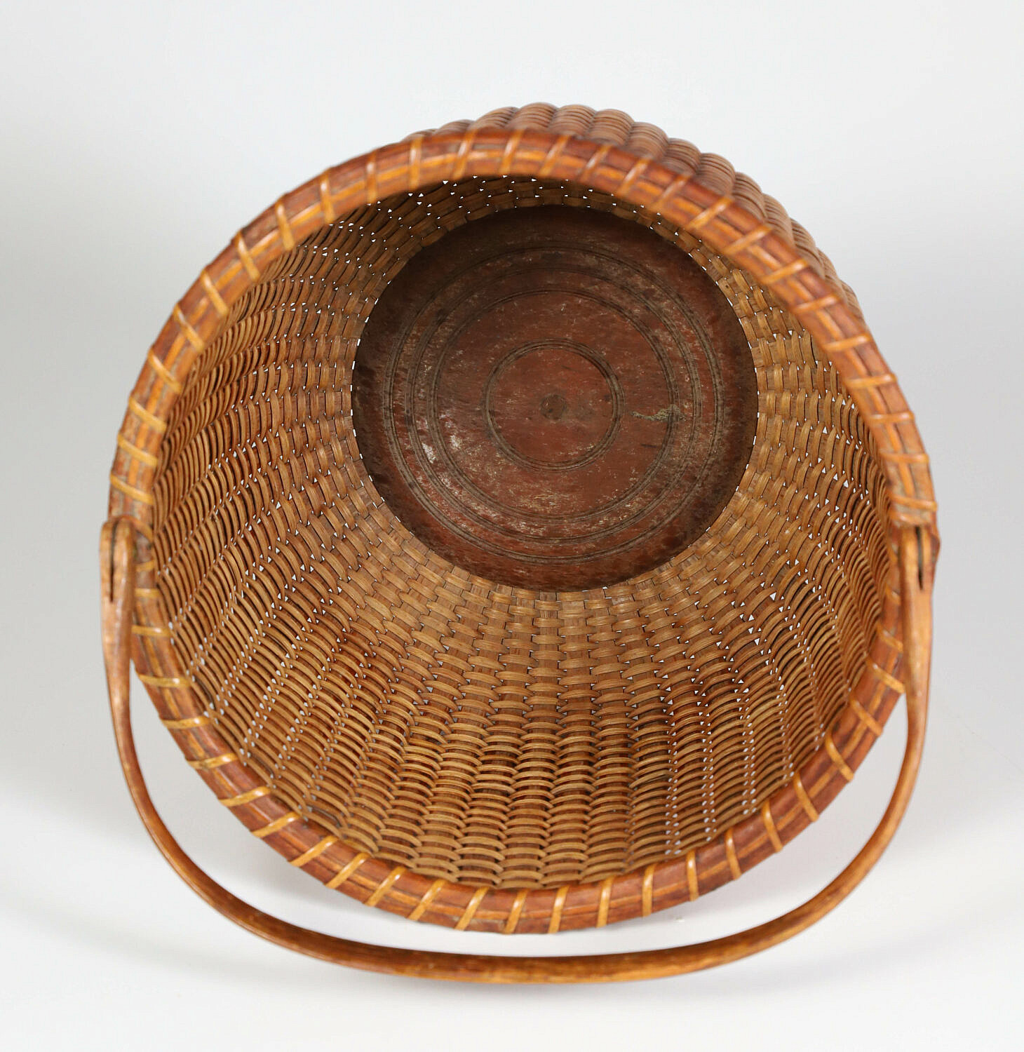 Vintage Round Open Swing Handle Nantucket Basket Ref #2-5382 Round Open Swing Handle Nantucket Basket, circa 1920s, with multiple concentric circles carved on the interior base, handle affixed with cut tin ears Height 7 in. Diameter 9 in. This item has been sold. X Visit our BUY IT NOW collection - frequent new additions ENTER