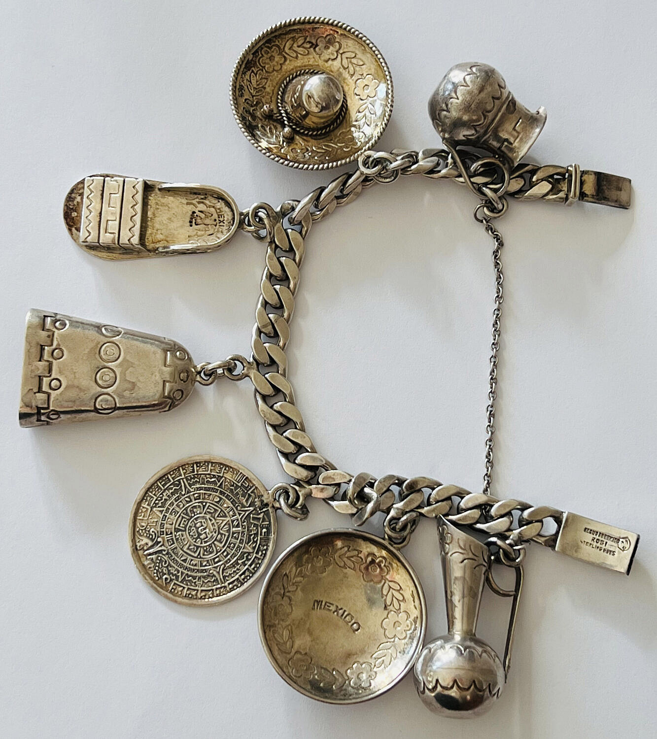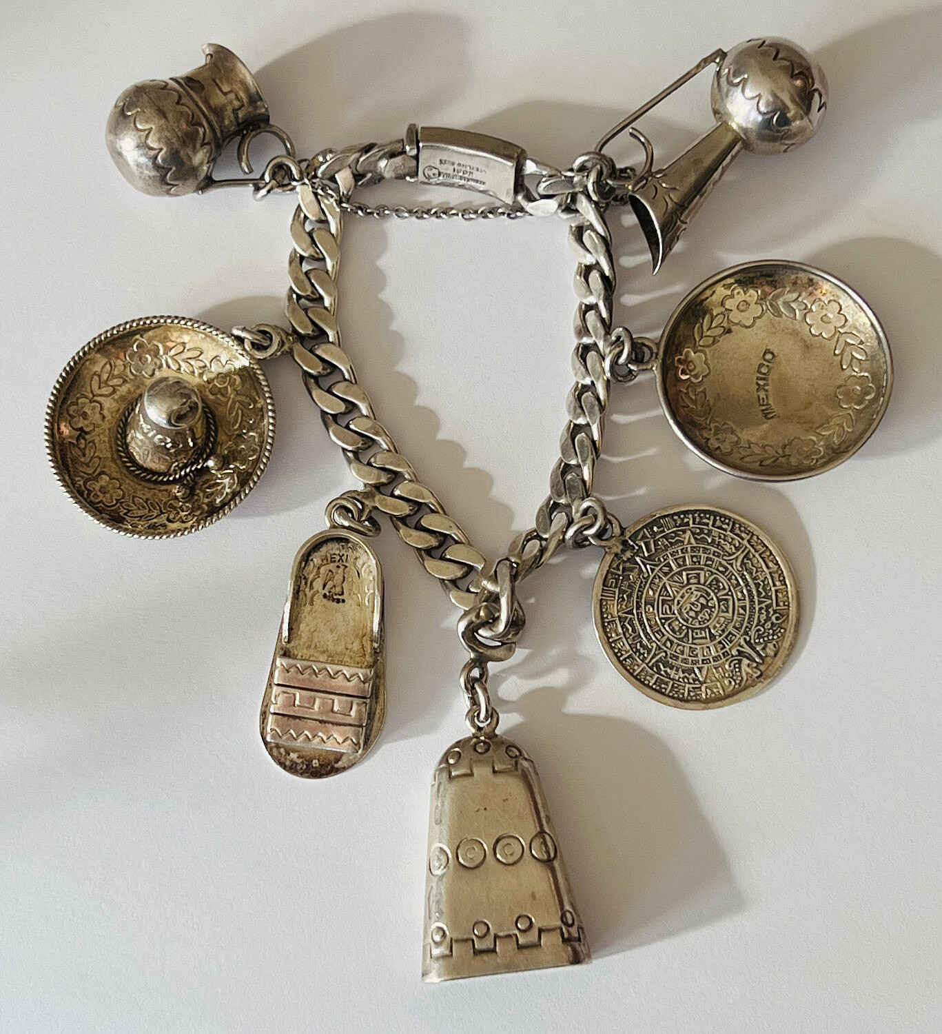 Vintage Seguoen Rosi Mexico Sterling Silver Charm Bracelet Ref #38662 Vintage Seguoen Rosi Mexico Sterling Silver Charm Bracelet with sombrero, bell, sandal, pitcher, coin, bowl, ewer, signed This item has been sold. X Visit our BUY IT NOW collection - frequent new additions ENTER